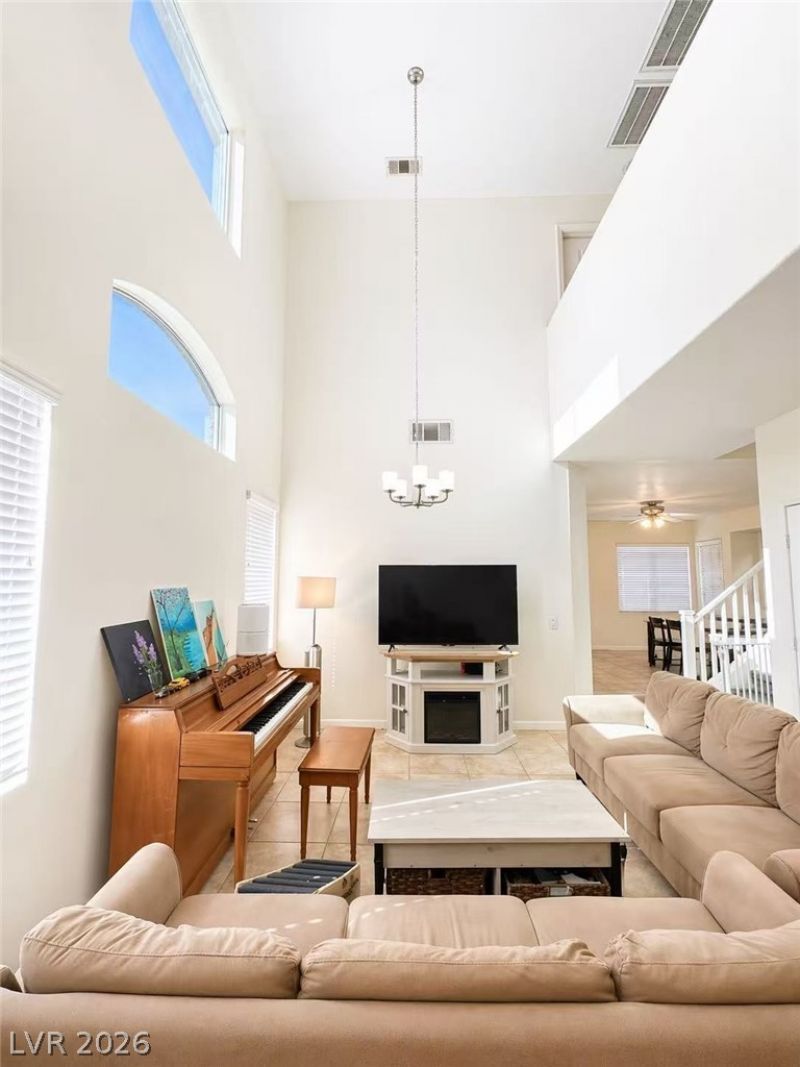 Stunning corner lot 2-story house with 5 bedrooms, 3 bathrooms, and a 2-car garage in Southern Highlands. The entry welcomes you with soaring high ceilings, upper skylight-style windows, ceiling fans, and tile flooring throughout the entire downstairs, plus a bedroom and shower bathroom provide added convenience for guests. Sunny kitchen offers plenty of cabinets and a center island, creating a functional and open space. Upgraded primary bedroom features French doors, bathroom with dual sinks and a large custom closet. Enjoy a huge backyard and Front lawn with mature trees. Conveniently located near parks, schools, shopping¦ This energy-efficient home also includes paid-off solar panels and dual-pane windows.